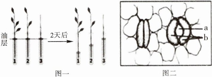 23.(新理念·探究实践)科学实践活动中,同学们发现温室大棚的内壁凝结了水珠,根据学过的生物学知识,同学们认为除了土壤中水分的蒸发,水还来自植物的蒸腾作用。那么,植物体什么结构与蒸腾作用有关呢?同学对该问题作出来假设,并通过图一所示实验装置进行了实验验证。
