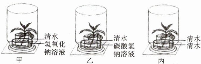 探究活动三:小明同学进行“二氧化碳是光合作用必需的原料吗?”的探究实验时从老师那里知道了“小苏打”(即碳酸氢钠)可以产生二氧化碳,灵机一动设计了如图所示的三组密闭装置(提示:装置中的氢氧化钠溶液能吸收二氧化碳,碳酸氢钠溶液能释放二氧化碳)。据图分析并回答问题。