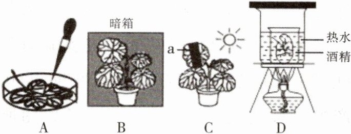 (2)步骤B将天竺葵置于暗处的原因是______________________________;步骤D用酒精灯水浴加热,可以观察到酒精颜色变绿,这是因为细胞结构中控制物质进出的________被破坏,叶片中的________容易溶解在酒精中。