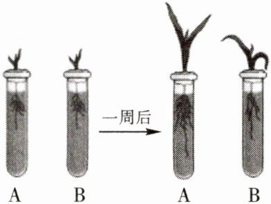 将两株同样大小的健壮玉米幼苗,分别培养在盛有等量蒸馏水和土壤浸出液的试管中,一周后,观察这两株幼苗的长势如图所示。