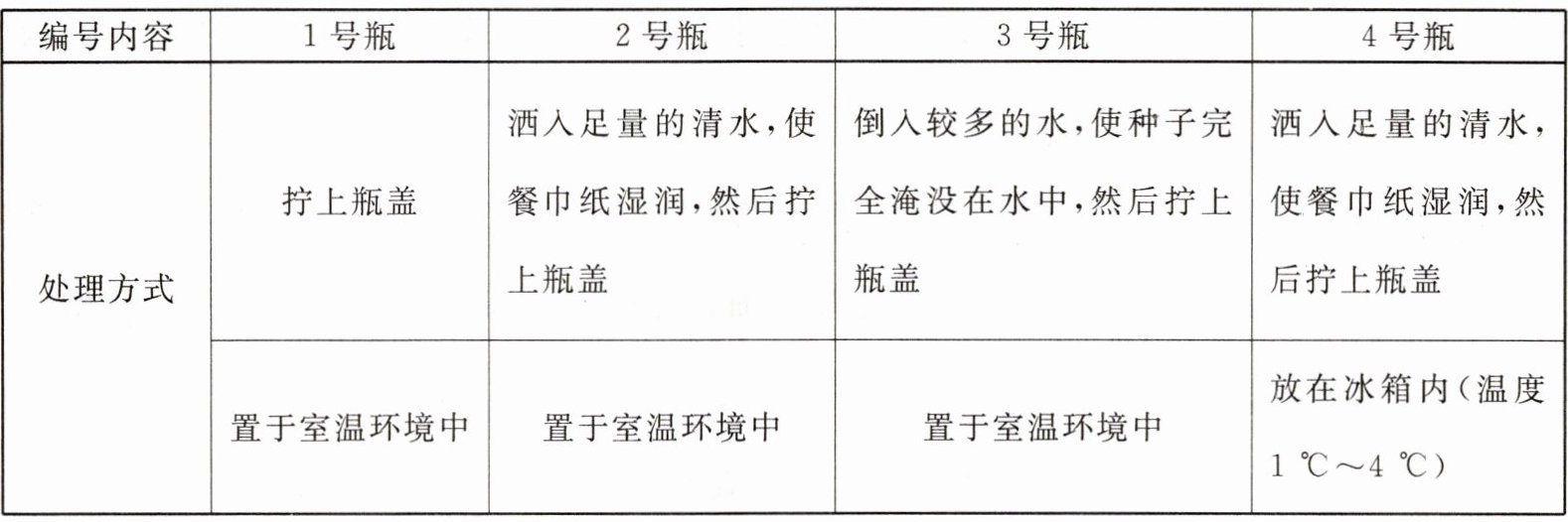 ②在4个瓶中各放入2张餐巾纸,并在餐巾纸上均匀放上10粒绿豆种子,然后依照下表中处理方式操作。