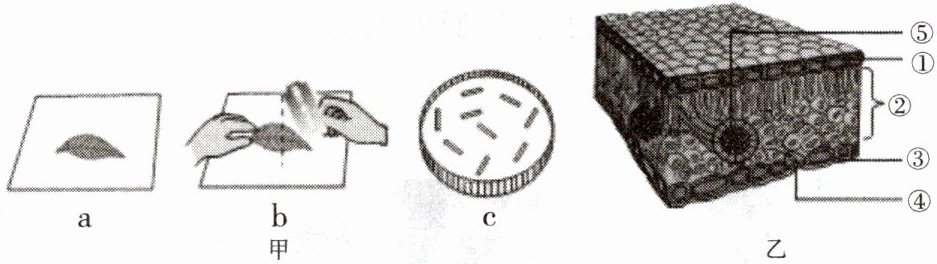 21.(5分)如图甲为“观察叶片的结构”实验的部分操作步骤,图乙为叶片横切面示意图。请据图回答下列问题。