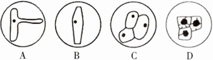 8.在显微镜下观察根尖的结构时发现,某一区域的细胞多呈正方形,排列紧密,部分细胞处于分裂状态,此部位的细胞示意图可表示为下图的 ( )