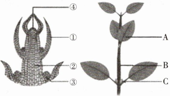 分生组织@@枝条@@茎@@叶@@芽@@A@@叶@@B@@茎@@C@@芽