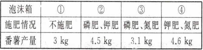 ②小明家种植的番薯总比邻近地的产量低。小明尝试探寻原因,他准备了四个大泡沫箱分别装满自家地里的土壤,放在阳台栽培番薯,每个箱子种植同种番薯,除施肥不同外,其他条件都相同。一段时间后,得到如表的结果,请判断小明家种植番薯时最可能缺乏的是________肥。