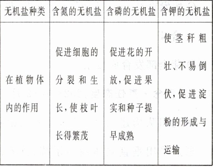 (4)植物生长需要量最多的无机盐是含氮、磷、钾的无机盐,这三种无机盐在植物体内的作用如下表。