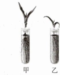 23.(新理念·探究实践)植物的生长需要水和无机盐。为探究植物的生长需要无机盐,小明同学进行了以下实验:取两支相同的试管,甲试管中装有肥沃的土壤浸出液,乙试管中装有蒸馏水,在其中各培养一株大小相同的健壮幼苗,一段时间后观察两株幼苗的长势,结果如图所示。