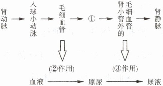 18.下图为人体内尿液形成过程示意图,图中①、②、③表示的结构(或生理作用)分别是 ( )