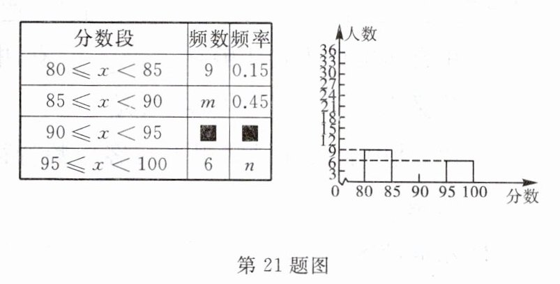 21. 为迎接中国共产党建党103周年,某县举办歌咏比赛活动,参赛同学的成绩分别绘制成频数分布表和频数分布直方图(均不完整)如下.
