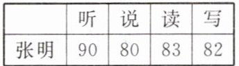 若把听、说、读、写的成绩按3∶3∶2∶2计算平均成绩,则张明的平均成绩为( )