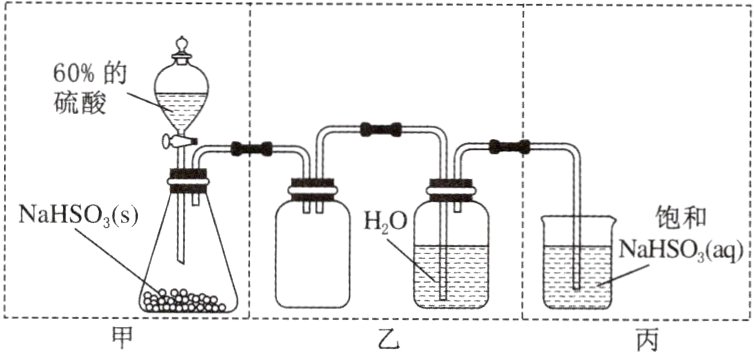 C 解析 $60\%$的硫酸和$NaHSO_{3}(s)$可发生反应$H_{2}SO_{4} + 2NaHSO_{3} = Na_{2}SO_{4} + 2SO_{2}\uparrow + 2H_{2}O$,因此装置甲可以制取$SO_{2}$气体,A项正确;气体通入液体时“长进短出”,装置乙可以制取$SO_{2}$水溶液,B项正确;$SO_{2}$不能与饱和$NaHSO_{3}$溶液发生反应,因此装置丙不能吸收尾气中的$SO_{2}$,C项错误;$SO_{2}$水溶液显酸性,可用干燥的$pH$试纸检验其酸性,D项正确。
