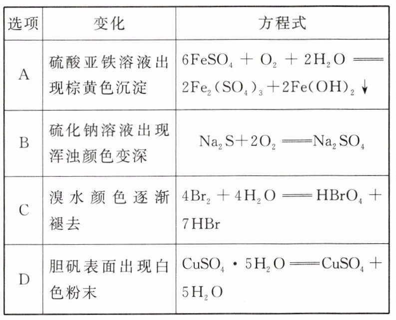 D 解析 溶液出现棕黄色沉淀是因为产生了$Fe(OH)_{3}$沉淀,化学方程式为$12FeSO_{4} + 3O_{2} + 6H_{2}O=4Fe_{2}(SO_{4})_{3} + 4Fe(OH)_{3}\downarrow$,A 项错误;硫化钠在空气中易被氧气氧化为淡黄色固体单质硫,使颜色加深,化学方程式为$2Na_{2}S + O_{2} + 2H_{2}O=4NaOH + 2S\downarrow$,B 项错误;溴水的主要成分是溴和水,它们会反应,但速度很慢$Br_{2} + H_{2}O=HBrO + HBr$,$2HBrO=2HBr + O_{2}\uparrow$,所以溴水放置太久会变质,但不是生成高溴酸,所以选项中的化学方程式错误,C 项错误;胆矾为$CuSO_{4}\cdot 5H_{2}O$,颜色为蓝色,如果表面失去结晶水,则变为白色的$CuSO_{4}$,化学方程式为$CuSO_{4}\cdot 5H_{2}O=CuSO_{4} + 5H_{2}O$,方程式正确,D 项正确。