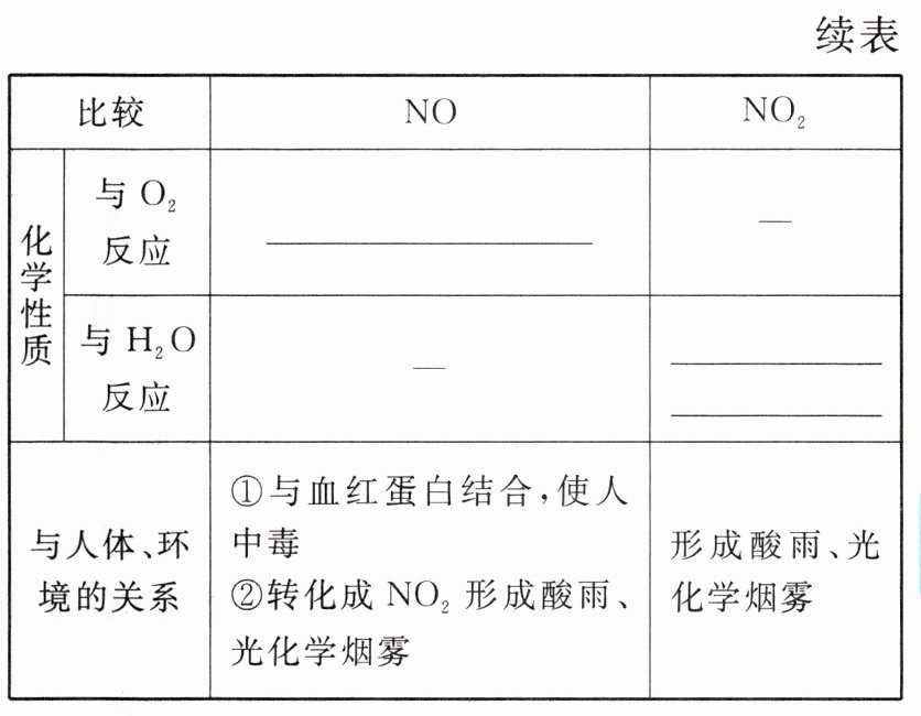 无色 红棕色 有毒 有毒 不溶于水 易溶于水$2NO + O_{2}=2NO_{2}$ $3NO_{2} + H_{2}O=2HNO_{3} + NO$