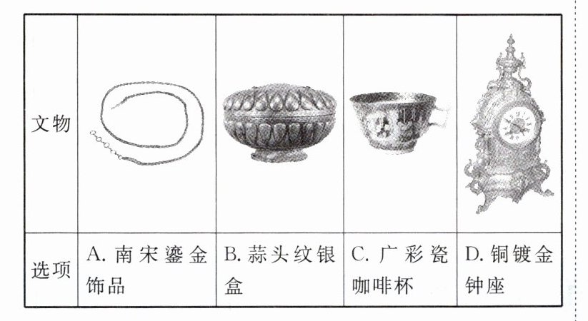 C 解析 鎏金饰品是用金汞合金制成的金泥涂饰器物的表面,经过烘烤,汞蒸发而金固结于器物上的一种传统工艺,其中不含硅酸盐,A项不符合题意;蒜头纹银盒的主要成分为金属银,其中不含硅酸盐,B项不符合题意;广彩瓷咖啡杯是由黏土等硅酸盐产品烧制而成,其主要成分为硅酸盐,C项符合题意;铜镀金钟座是由铜和金等制成的,其中不含硅酸盐,D项不符合题意。