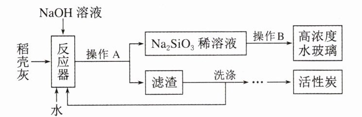 A 解析 稻壳灰来源广泛,价格低廉,活性炭具有吸附性,有较高的经济价值,A项正确;操作A为过滤,操作B为蒸发浓缩,是两种不同的操作,B项错误;二氧化硅中硅元素的化合价是+4价,硅酸钠中硅元素的化合价也是+4价,所以该流程中硅元素的化合价没有发生改变,C项错误;反应器中发生的反应为$SiO_{2}+2NaOH = Na_{2}SiO_{3}+H_{2}O$,此反应没有元素化合价的变化,属于非氧化还原反应,D项错误。