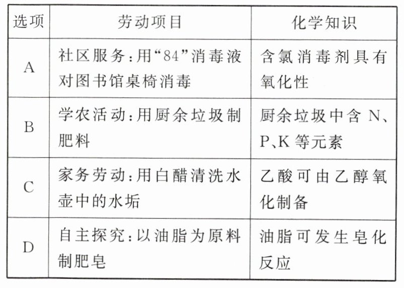 C 解析 “84”消毒液中含有具有强氧化性的次氯酸钠,能起到杀菌消毒的作用,则用“84”消毒液对图书馆桌椅消毒与含氯消毒剂具有氧化性有关,A项不符合题意;含有氮、磷、钾的物质常用作化肥,则厨余垃圾制肥料与厨余垃圾含有氮、磷、钾等元素有关,B项不符合题意;用白醋清洗水壶中的水垢与乙酸的酸性有关,与乙酸可由乙醇氧化制备无关,C项符合题意;油脂在碱性条件下可发生水解反应生成甘油和可制作肥皂的高级脂肪酸盐,则以油脂为原料制备肥皂与油脂可发生皂化反应有关,D项不符合题意。
