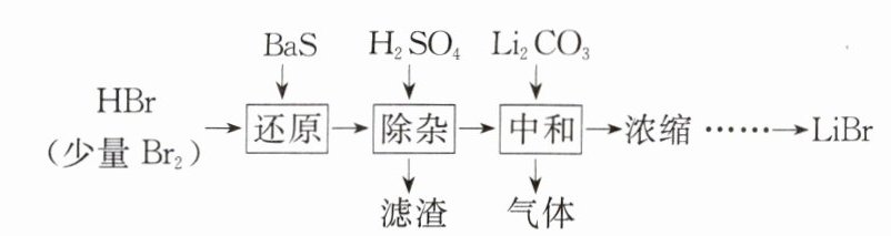A 解析 还原工序逸出的Br₂用NaOH溶液吸收,吸收液中含有NaBr和NaBrO等物质,若直接返回还原工序,则产品中会有一定量的NaBr,导致产品的纯度降低,A项错误;除杂工序中产生的滤渣为BaSO₄和硫,硫可溶于煤油,而BaSO₄不溶于煤油,因此可用煤油进行组分分离,B项正确;中和工序中,Li₂CO₃和HBr发生反应生成LiBr、CO₂和H₂O,该反应的化学方程式为Li₂CO₃ + 2HBr = CO₂↑ + 2LiBr + H₂O,C项正确;根据电子转移守恒可知,溴和硫化钡反应时物质的量之比为1 : 1;根据硫酸钡的化学组成及钡元素守恒可知,n(BaS) : n(H₂SO₄)为1 : 1,因此,参与反应的n(Br₂) : n(BaS) : n(H₂SO₄)为1 : 1 : 1,D项正确。