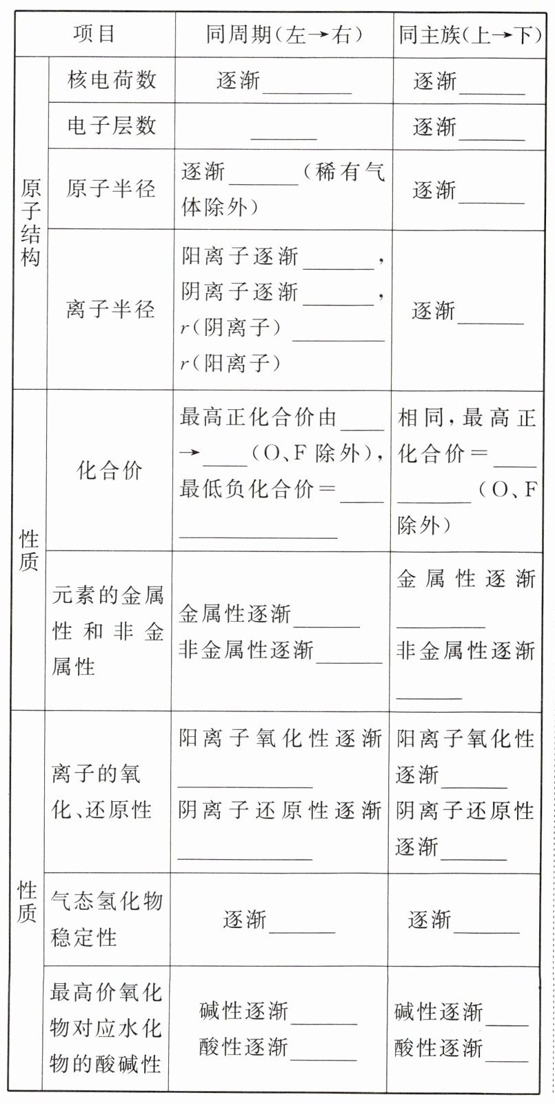 3.增大 增大 相同 增多 减小 增大 减小 减小 > 增大 +1 ~+7 -(8-主族族序数) 主族族序数 减弱 增强 增强 减弱 增强 减弱 减弱 增强 增强 减弱 减弱 增强 增强 减弱