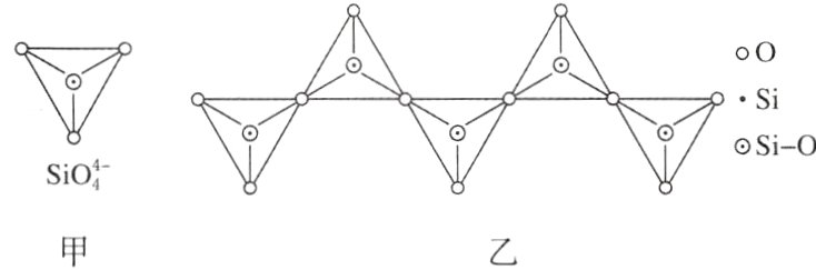 (4)依据题图甲可知,SiO₄⁴⁻的空间结构类似于甲烷分子,为正四面体形,硅原子的杂化轨道类型和甲烷分子中碳原子的杂化轨道类型相同,为sp³;题图乙是一种无限长单链结构的多硅酸根,每个结构单元中两个氧原子与另外两个结构单元顶角共用,所以每个结构单元含有1个Si原子、3个O原子,Si和O的原子数之比为1 : 3,化学式可表示为[SiO₃]ₙ²ⁿ⁻或SiO₃²⁻。