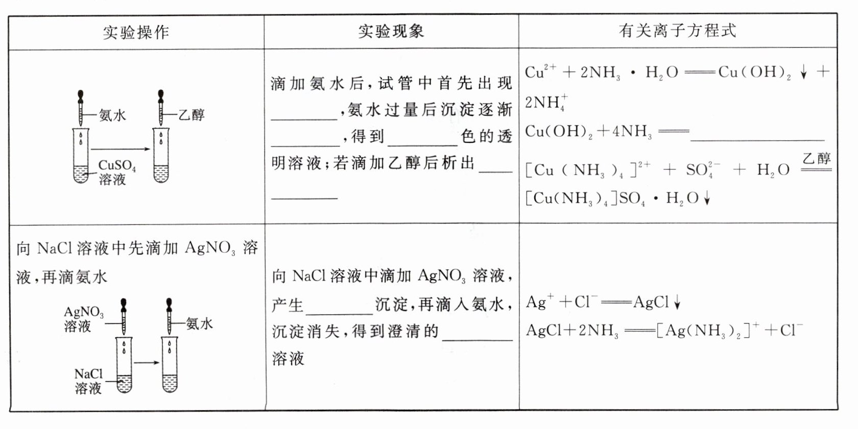 (3)蓝色沉淀 溶解 深蓝 深蓝色晶体 $[Cu(NH_{3})_{4}]^{2 + } + 2OH^{-}$ 白色 无色