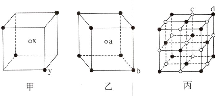 1. 如图是甲、乙、丙三种晶体的晶胞,则甲晶体中x与y的个数比是______,乙中a与b的个数比是______,丙中一个晶胞中有________个c离子和________个d离子。