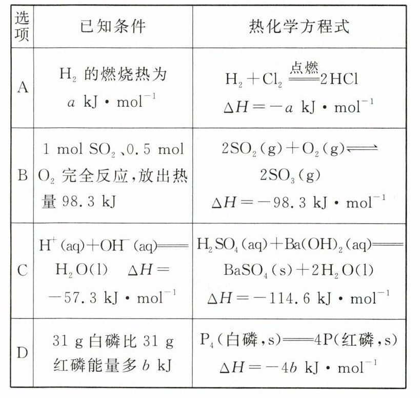 D 解析 选项A中符合已知条件的应是H₂和O₂反应,A项错误;ΔH应为-196.6 kJ·mol⁻¹,B项错误;选项C中由于生成BaSO₄沉淀,放出的热量大于114.6 kJ,C项错误。