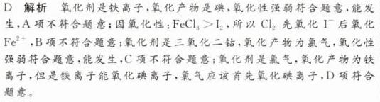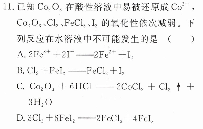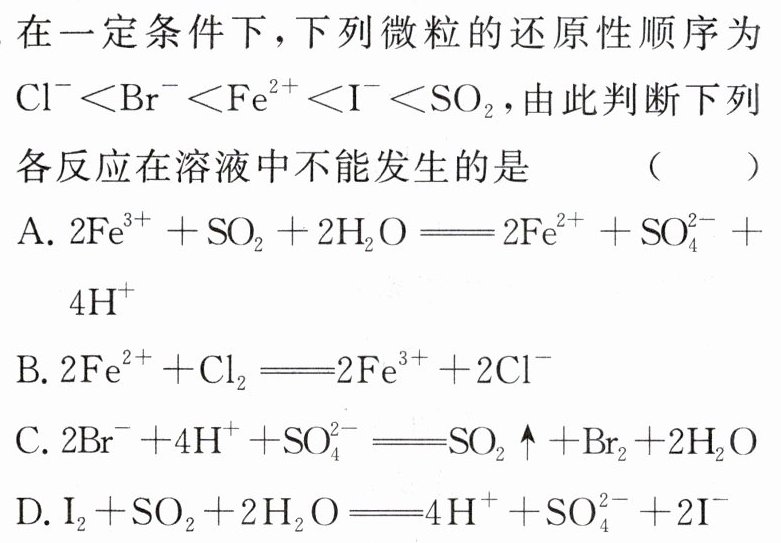 10.C 解析 由题意“还原性Cl⁻<Br⁻<Fe²⁺<I⁻<SO₂”,可知还原性Br⁻<SO₂,C项违背氧化还原反应的强弱规律,正确的写法应为SO₂ + Br₂ + 2H₂O = 2Br⁻ + 4H⁺ + SO₄²⁻。