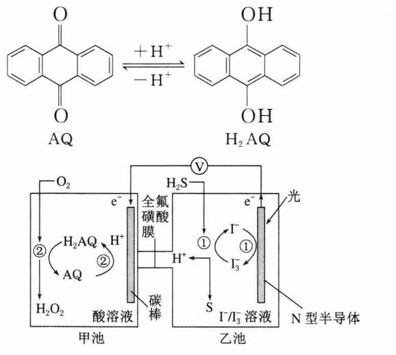 应用4 D 解析 根据题图中的电子流向可判断出甲池中碳棒是正极,该电极上发生得电子的还原反应,即AQ + 2H⁺ + 2e⁻ = H₂AQ,A项正确;在乙池中,硫化氢失电子生成硫单质,I₃⁻得电子生成I⁻,发生的反应为H₂S + I₃⁻ = 3I⁻ + S↓ + 2H⁺,B项正确;根据题图中信息可知该装置将光能转化为电能,C项正确;该装置是原电池装置,阳离子移向正极,甲池中碳棒是正极,所以H⁺从乙池移向甲池,D项错误。