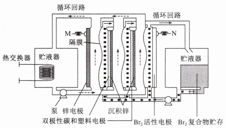 5.B 解析 在该原电池中,活泼金属锌作负极,则N极为正极,A项正确;放电时,左侧锌放电产生Zn²⁺,贮液器中ZnBr₂浓度不断增大,B项错误;充电时,M极为阴极,电极反应式为Zn²⁺ + 2e⁻ = Zn,C项正确;放电时Br⁻通过隔膜进入溶液中与Zn²⁺结合,充电时Zn²⁺通过隔膜在双极性碳和塑料电极上沉积,D项正确。