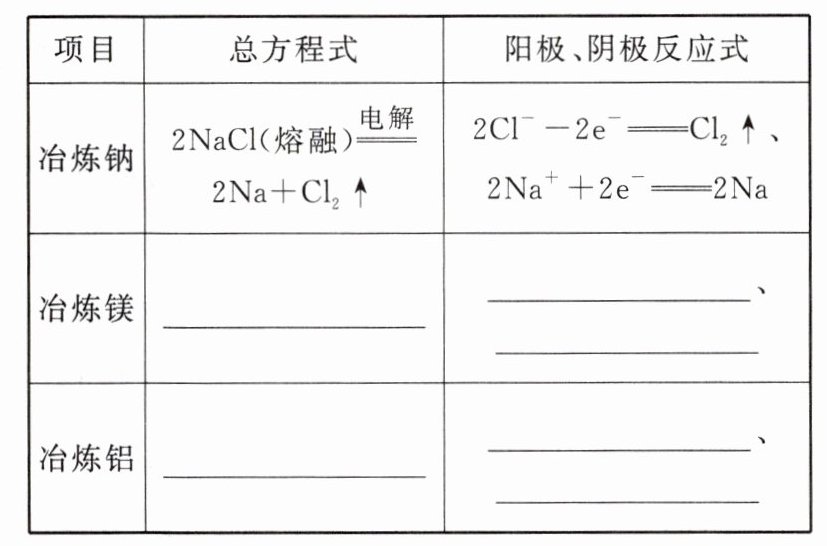 $MgCl_{2}(熔融)\xlongequal{电解}Mg + Cl_{2}\uparrow$ $2Cl^{-}-2e^{-}=Cl_{2}\uparrow$ $Mg^{2+}+2e^{-}=Mg$ $2Al_{2}O_{3}(熔融)\xlongequal{电解}4Al + 3O_{2}\uparrow$ $6O^{2-}-12e^{-}=3O_{2}\uparrow$ $4Al^{3+}+12e^{-}=4Al$