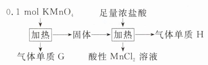 4.B 解析 KMnO₄固体受热分解生成K₂MnO₄、MnO₂、O₂,K₂MnO₄、MnO₂均具有氧化性,在加热条件下能与浓盐酸发生氧化还原反应,反应过程中Cl⁻被氧化为Cl₂,K₂MnO₄、MnO₂被还原为MnCl₂,因此气体单质G为O₂,气体单质H为Cl₂。加热KMnO₄固体的反应中,O元素化合价由 - 2价升高至0价,被氧化,加热K₂MnO₄、MnO₂与浓盐酸的反应中,Cl元素化合价由 - 1价升高至0价,被氧化,因此O₂和Cl₂均为氧化产物,A项正确;KMnO₄固体受热分解过程中,Mn元素化合价降低被还原,部分O元素化合价升高被氧化,因此KMnO₄既是氧化剂也是还原剂,B项错误;Mn元素在反应过程中物质及化合价变化为KMnO₄$\xrightarrow{加热}$K₂MnO₄$\xrightarrow{浓盐酸、加热}$MnCl₂,MnO₂$\xrightarrow{浓盐酸、加热}$MnCl₂,Mn元素至少参加了3个氧化还原反应,C项正确;生成1molO₂转移4mol电子,生成1molCl₂转移2mol电子,若KMnO₄转化为MnCl₂过程中得到的电子全部是Cl⁻生成Cl₂所失去的,则气体的物质的量最大,由2KMnO₄~5Cl₂可知,n(气体)max = 0.25mol,但该气体中一定含有O₂,因此最终所得气体的物质的量小于0.25mol,D项正确。