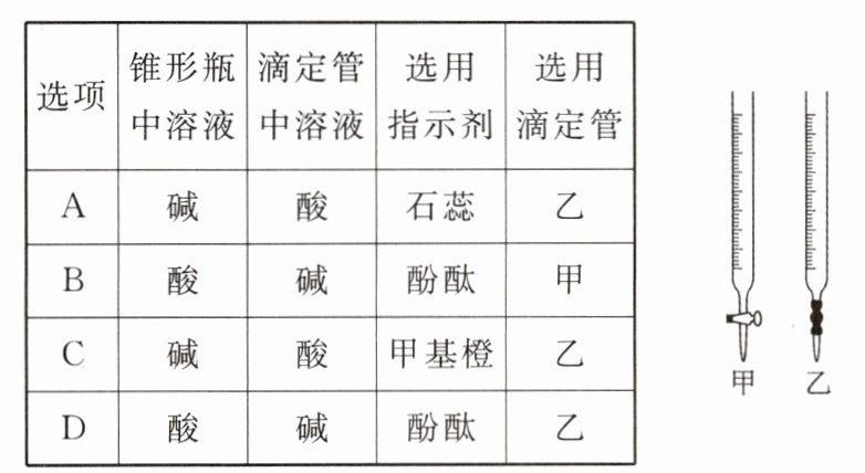 1.D 解析 解答本题的关键是①明确酸式、碱式滴定管使用时的注意事项;②指示剂的变色范围。酸式滴定管不能盛放碱液,而碱式滴定管不能盛放酸液,指示剂应选择颜色变化明显的酚酞或甲基橙,不能选用石蕊。