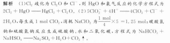 (2)ClO₂常温下为黄色气体,易溶于水,其水溶液是一种广谱杀菌剂。一种有效成分为NaClO₂、NaHSO₄、NaHCO₃的“二氧化氯泡腾片”能快速溶于水,溢出大量气泡,得到ClO₂溶液。上述过程中,生成ClO₂的反应属于歧化反应,每生成1 mol ClO₂消耗NaClO₂的量为________mol;产生“气泡”的化学方程式为__________________________。
