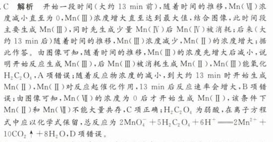 2.(2023·辽宁卷)一定条件下,酸性KMnO₄溶液与H₂C₂O₄发生反应,Mn(Ⅱ)起催化作用,过程中不同价态含Mn粒子的浓度随时间变化如图所示。