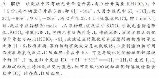 3.(2021·湖南卷)KIO₃常用作食盐中的补碘剂,可用“氯酸钾氧化法”制备,该方法的第一步反应为6I₂+11KClO₃+3H₂O$\xlongequal{\triangle}$6KH(IO₃)₂+5KCl+3Cl₂↑。下列说法错误的是 ( )