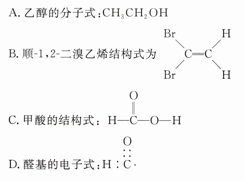 C 解析 乙醇的分子式为 C₂H₆O,结构简式为 CH₃CH₂OH,A 项错误;顺 - 1,2 - 二溴乙烯的结构式为