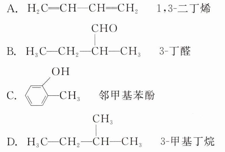 C 解析 A项的名称为1,3-丁二烯,错误;B项的名称为2-甲基丁醛,错误;D项的名称为2-甲基丁烷,错误。