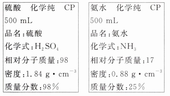 (1)利用$c=\frac{1000\rho w}{M}$计算,$c(H_{2}SO_{4})=\frac{1000\times1.84\times98\%}{98}mol\cdot L^{-1}=18.4mol\cdot L^{-1}$,$c(NH_{3})=\frac{1000\times0.88\times25\%}{17}mol\cdot L^{-1}\approx12.9mol\cdot L^{-1}$。