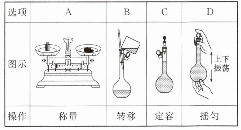 A 解析:选取500 mL容量瓶配制Na₂CO₃溶液,称取Na₂CO₃固体的质量为0.5 L×1.00 mol·L⁻¹×106 g·mol⁻¹ = 53.0 g,A项正确;④和⑤操作是洗涤及将洗涤液转移到容量瓶中,未进行上述操作,所配溶液的浓度将偏小,B项错误;定容后将容量瓶倒置摇匀,溶液粘在刻度线以上的瓶颈内壁上,液面会低于刻度线,待液体回流后液面会与刻度线相平,故不必加水,C项错误;Na₂CO₃固体溶于水放出热量,必须冷却至室温后才能转移到容量瓶中,D项错误。