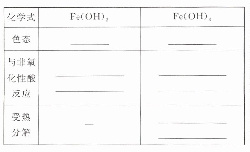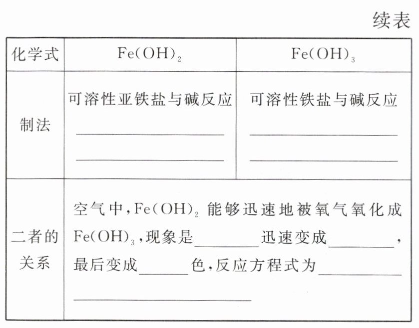 白色固体 红褐色固体 $Fe(OH)_{2} + 2H^{+} = Fe^{2+} + 2H_{2}O$ $Fe(OH)_{3} + 3H^{+} = Fe^{3+} + 3H_{2}O$ $2Fe(OH)_{3}\xlongequal{\triangle}Fe_{2}O_{3} + 3H_{2}O$ $Fe^{2+} + 2OH^{-} = Fe(OH)_{2}\downarrow$ $Fe^{3+} + 3OH^{-} = Fe(OH)_{3}\downarrow$ 白色沉淀 灰绿色 红褐 $4Fe(OH)_{2} + O_{2} + 2H_{2}O = 4Fe(OH)_{3}$
