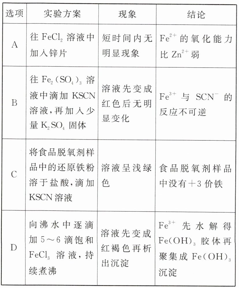 D 解析 往$FeCl_{2}$溶液中加入锌片,发生反应$Fe^{2 + }+Zn=Fe+Zn^{2 + }$,$Fe^{2 + }$的氧化能力比$Zn^{2 + }$的强,A 项错误;往$Fe_{2}(SO_{4})_{3}$溶液中滴加 KSCN 溶液,发生反应$Fe^{3 + }+3SCN^{-}\rightleftharpoons Fe(SCN)_{3}$,溶液变为红色,再加入少量$K_{2}SO_{4}$固体,对平衡无影响,故不能说明$Fe^{3 + }$与$SCN^{-}$的反应不可逆,B 项错误;若食品脱氧剂样品中有+3 价铁,铁粉与+3 价铁发生反应$Fe+2Fe^{3 + }=3Fe^{2 + }$,加入 KSCN 溶液,溶液呈浅绿色,C 项错误;向沸水中逐滴加入 5~6 滴饱和$FeCl_{3}$溶液,继续煮沸至溶液呈红褐色,得到$Fe(OH)_{3}$胶体,持续煮沸,$Fe(OH)_{3}$胶体发生聚沉,析出红褐色沉淀,D 项正确。