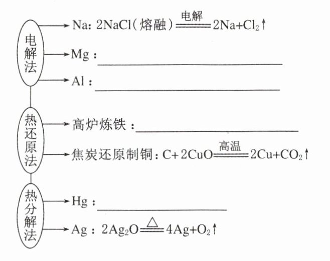 $MgCl_{2}(熔融)\stackrel{电解}{=\!=\!=}Mg + Cl_{2}\uparrow$ $2Al_{2}O_{3}(熔融)\stackrel{电解}{=\!=\!=}4Al + 3O_{2}\uparrow$(冰晶石) $3CO + Fe_{2}O_{3}\stackrel{高温}{=\!=\!=}2Fe + 3CO_{2}$ $2HgO\stackrel{\triangle}{=\!=\!=}2Hg + O_{2}\uparrow$
