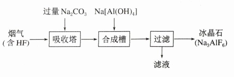 进阶1 C 解析 陶瓷中含有二氧化硅,能与氟化氢反应,故不宜用陶瓷作吸收塔内衬材料,A项正确;溶液喷淋法能提高溶液与烟气的接触面积,可提高吸收效率,B项正确;吸收塔中碳酸钠过量,溶液显碱性,故化学方程式为$HF + Na_{2}CO_{3}=NaHCO_{3}+NaF$,流程中合成槽后续操作需过滤,故有沉淀生成,故化学方程式为$Na[Al(OH)_{4}]+4NaHCO_{3}+6NaF=Na_{3}AlF_{6}\downarrow +4Na_{2}CO_{3}$,C项错误;由上述分析可知,滤液的主要成分为$Na_{2}CO_{3}$,可进入吸收塔循环利用,D项正确。