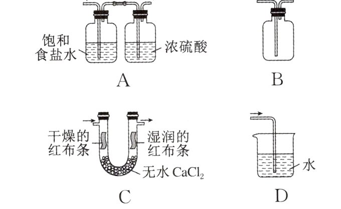 D 解析 浓盐酸易挥发,制备的氯气中含有$HCl$,可用饱和食盐水除去$HCl$,$Cl_{2}$可用浓硫酸干燥,$A$装置能达到实验目的,$A$项不符合题意;氯气的密度比空气的大,用向上排空气法收集,$B$装置能收集氯气,$B$项不符合题意;湿润的红布条褪色,干燥的红色布条不褪色,可验证干燥的氯气不具有漂白性,$C$项不符合题意;氯气在水中的溶解度较小,应用$NaOH$溶液吸收尾气,$D$装置不能达到实验目的,$D$项符合题意。