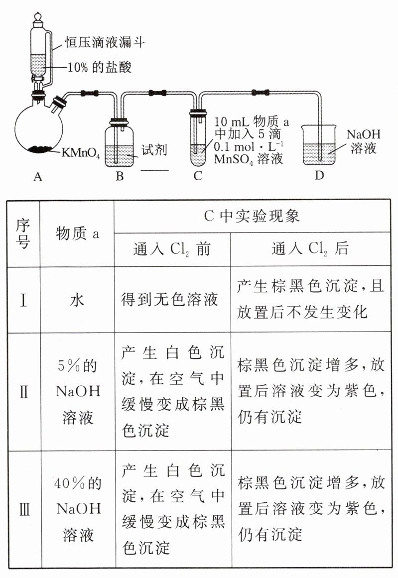 资料:ⅰ. $Mn^{2 + }$ 在一定条件下被 $Cl_{2}$ 或 $ClO^{-}$ 氧化成 $MnO_{2}$(棕黑色)、$MnO_{4}^{2 - }$(绿色)、$MnO_{4}^{-}$(紫色)。