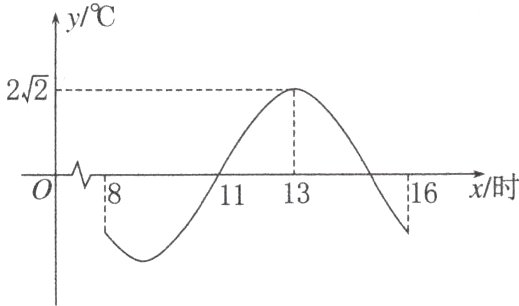 [例3]某年春节期间,$G$市某天$8~16$时的温度(单位:$^{\circ}C$)变化曲线(如图)近似满足函数$f(x) = 2\sqrt{2}\cos(\omega x + \varphi)(\omega > 0,0 < \varphi < \pi,x\in[8,16])$的图象。下列说法正确的是 ( )