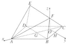 证明 如图,取$BC$的中点$H$,连接$OH$,则$OH// BD$,又四边形$ABCD$为正方形,所以$AC\perp BD$,所以$OH\perp AC$,故以$O$为原点,建立如图所示的空间直角坐标系,则$A(3,0,0)$,$C(-1,0,0)$,$D(1,-2,0)$,$F(0,0,\sqrt{3})$,$B(1,2,0)$。$\overrightarrow{BC}=(-2,-2,0)$,$\overrightarrow{CF}=(1,0,\sqrt{3})$,$\overrightarrow{BF}=(-1,-2,\sqrt{3})$。