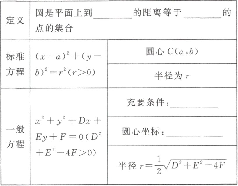 定点 定长 $D^{2}+E^{2}-4F>0$ $(-\frac{D}{2},-\frac{E}{2})$