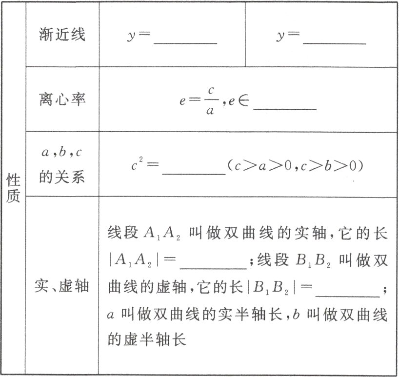 $x\leq -a$,或$x\geq a$ $y\leq -a$,或$y\geq a$ $(-a,0)$ $(a,0)$ $(0,-a)$ $(0,a)$ $\pm\frac{b}{a}x$ $\pm\frac{a}{b}x$ $(1,+\infty)$ $a^{2}+b^{2}$ $2a$ $2b$