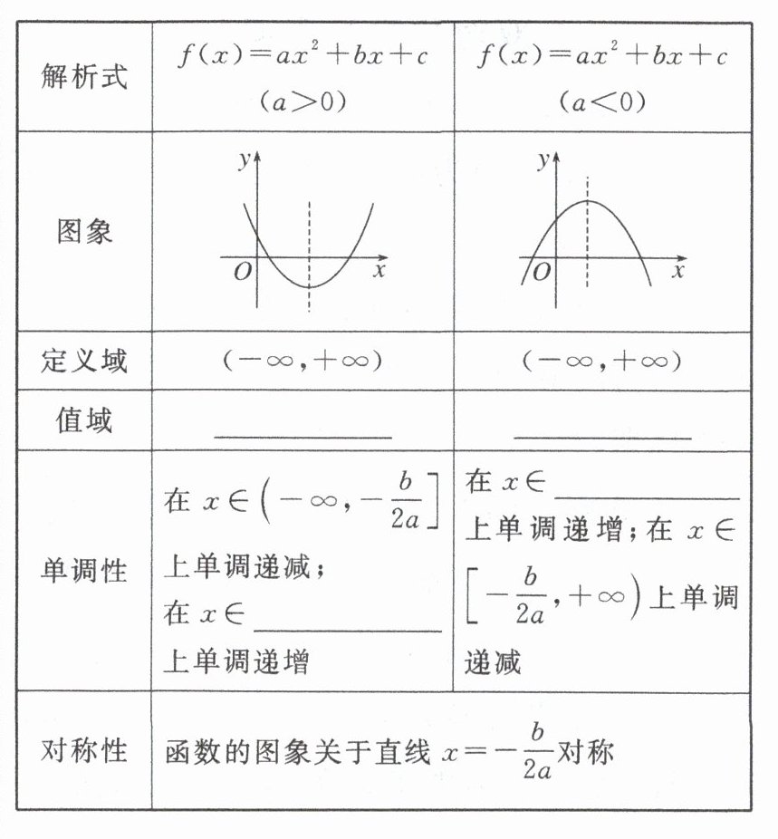 $y = x^{\alpha}$ $\left[\frac{4ac - b^{2}}{4a}, +\infty\right)$ $\left(-\infty, \frac{4ac - b^{2}}{4a}\right]$ $\left[-\frac{b}{2a}, +\infty\right)$ $\left(-\infty, -\frac{b}{2a}\right]$